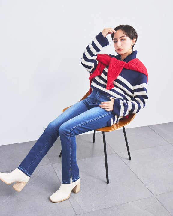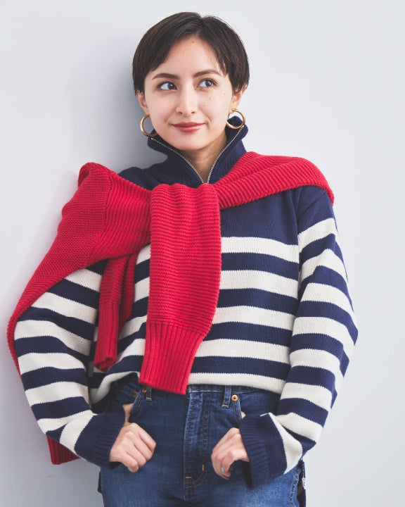 ネイビーのボーダーニットに赤のニットを肩掛けしたレイヤードスタイル。今季トレンドのハーフジップのセーターはデニムのようなカジュアルな着こなしがおすすめ。