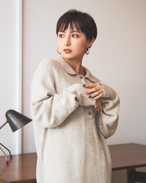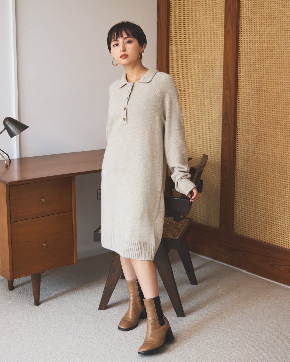 衿付きのニットワンピはゆったりとしたシルエットでカシミヤのようなソフトで温かみのある肌触りが特徴的な大人な一枚。ワンマイルウェアとしてもおすすめ。