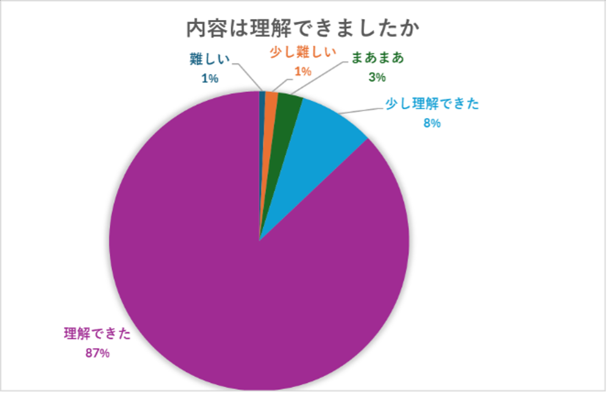 この授業ではクイズや事例を盛り込み、高校生にも理解しやすく「包括的性教育」について授業を執り行いました。普段の保健体育の授業内容に沿って、性感染症について、若年妊娠について、わかりやすくお話ししました。開催後のアンケートでは、参加生徒147名のうち、87%が講演の内容を「理解できた」と回答。また、94%の生徒が授業が「参考になった」と評価しました。