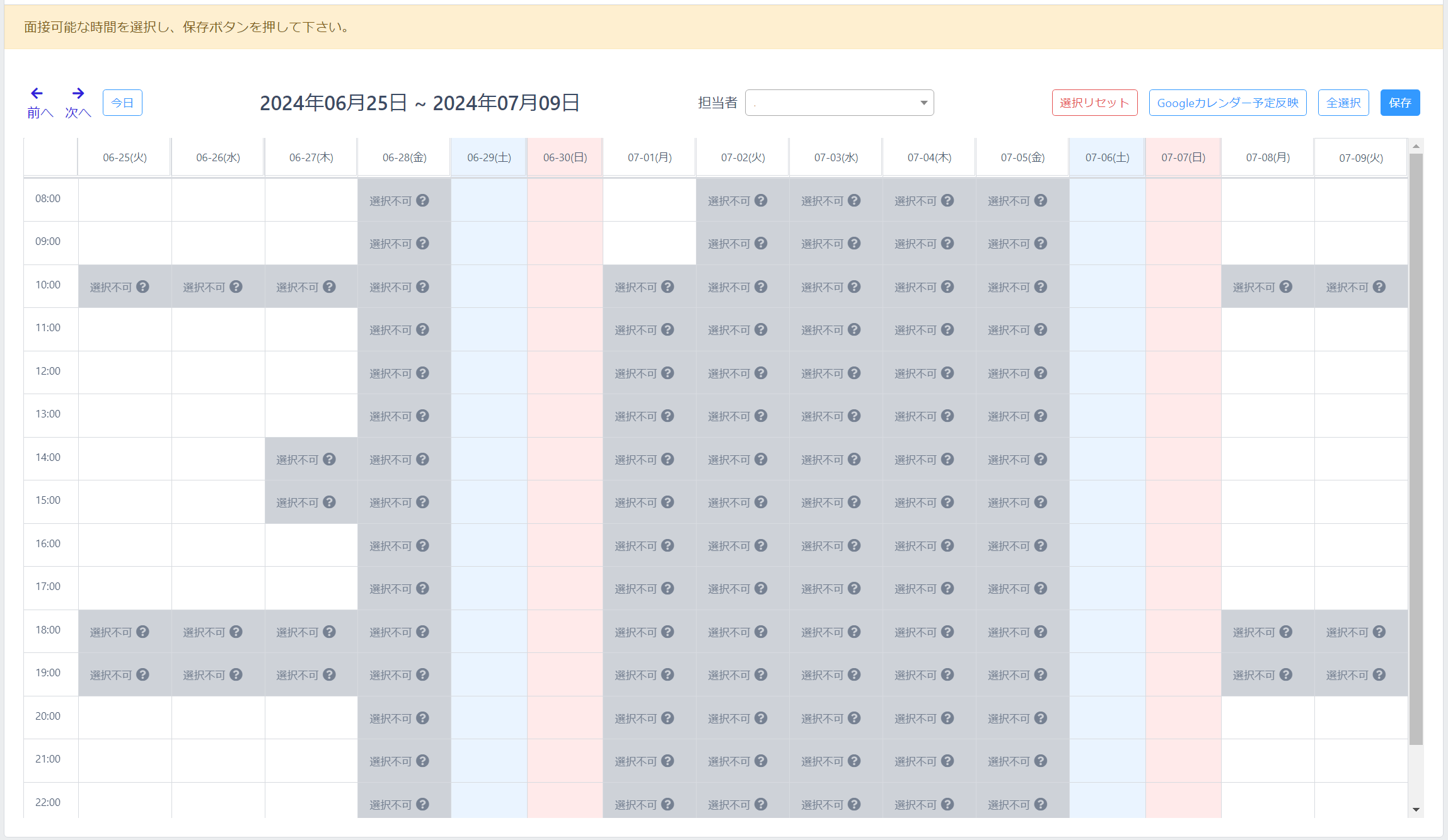 Googleカレンダーに登録している予定をSOKUMEN日程調整の空き枠設定画面に反映させ、誤って予定の入っている日時に空き枠を設定してしまうことを防ぐ機能です。この機能を利用することでダブルブッキングを防いだり、代わりに自分以外の面接官の空き枠を設定する時に本人に予定を確認しなくてもミスなく空き枠設定が出来るようになります。