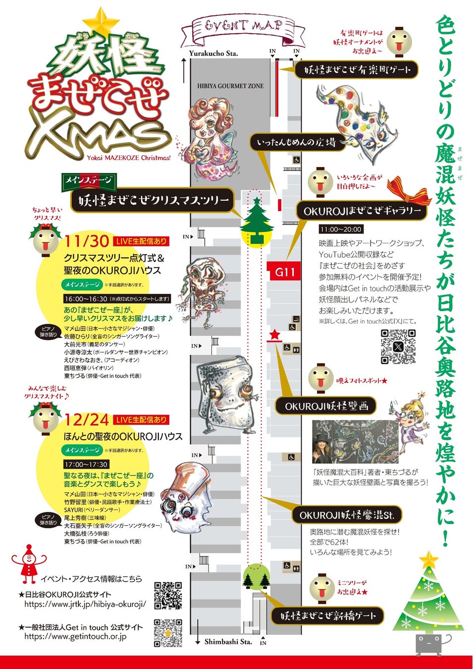 今年の日比谷OKUROJIのクリスマスでは、一般社団法人Get in touch(東ちづる代表)との共催により、色とりどりの妖怪たちが演出する「妖怪まぜこぜXmas」を開催します。