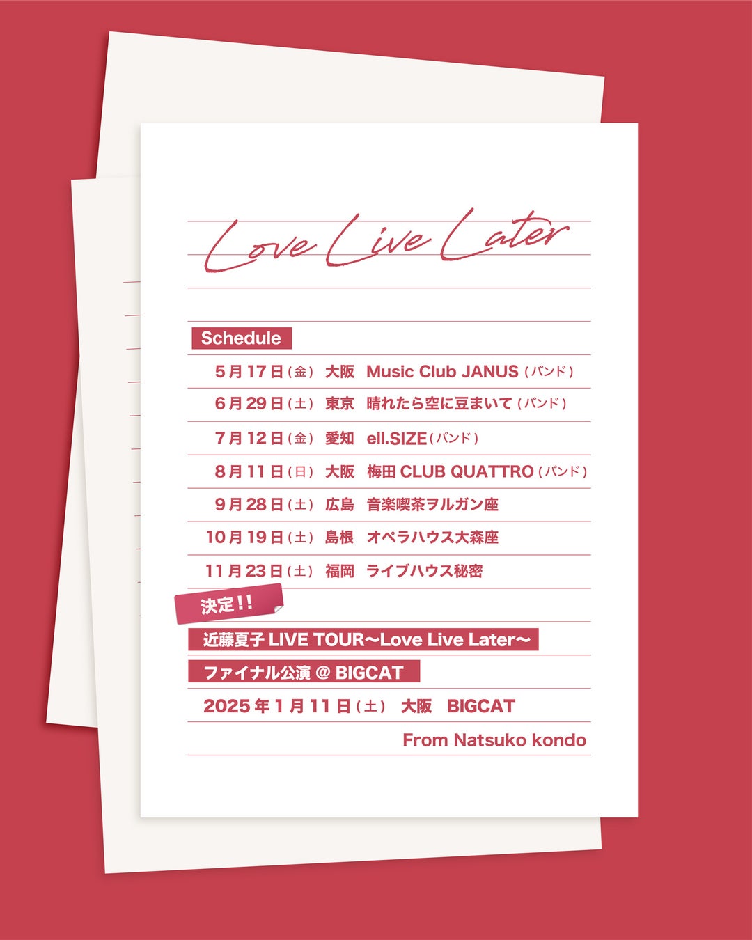 なお、近藤夏子は5月より全国7カ所をまわるワンマンライブ「近藤夏子ワンマンライブツアー2024〜Love Live Later〜」を開催中。2025年1月11日(土)にはファイナル公演として大阪BIGCATでのライブが決定している。チケット情報など詳細は公式サイトにて随時アナウンスされる。