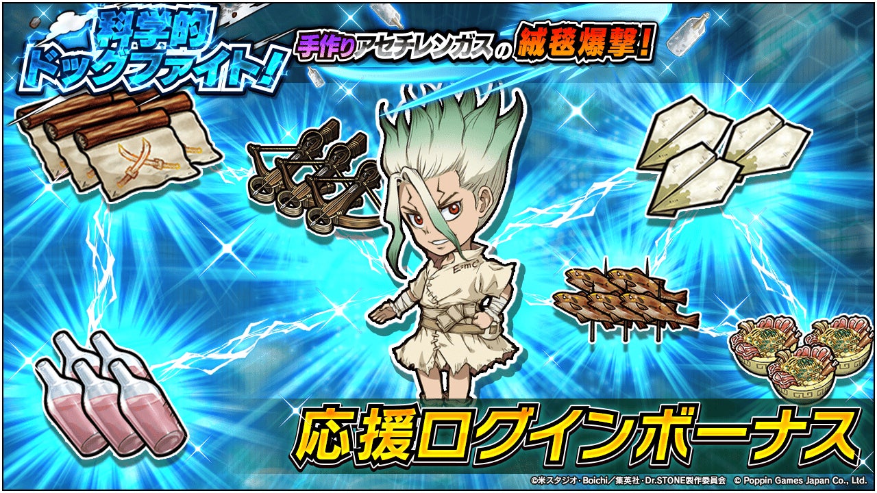 ポッピンゲームズジャパン株式会社は、AppStore/GooglePlayで配信中の『Dr.STONE バトルクラフト』にて新イベント&新ガチャを開催したことをお知らせいたします。