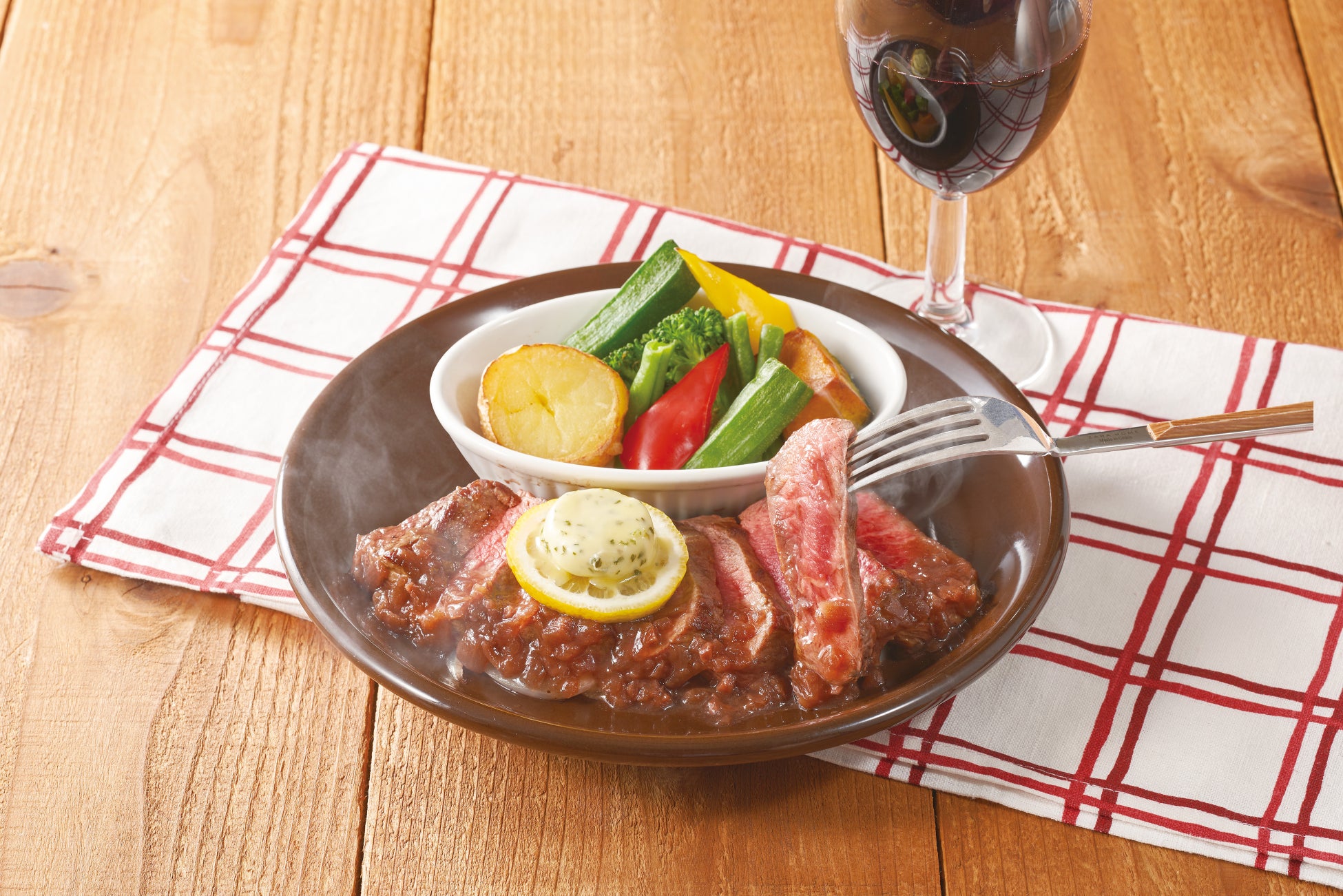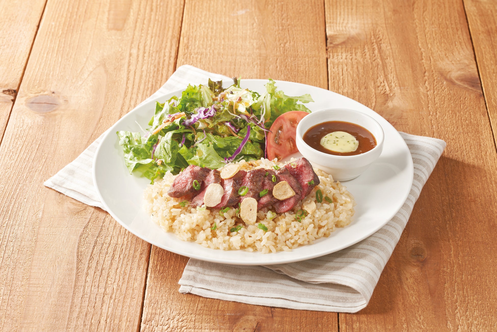 みすじステーキとガーリックピラフのベストマッチな組み合わせは、デミバターソースと相性抜群。キヌアサラダを添えた、バランスの良いワンプレートです。