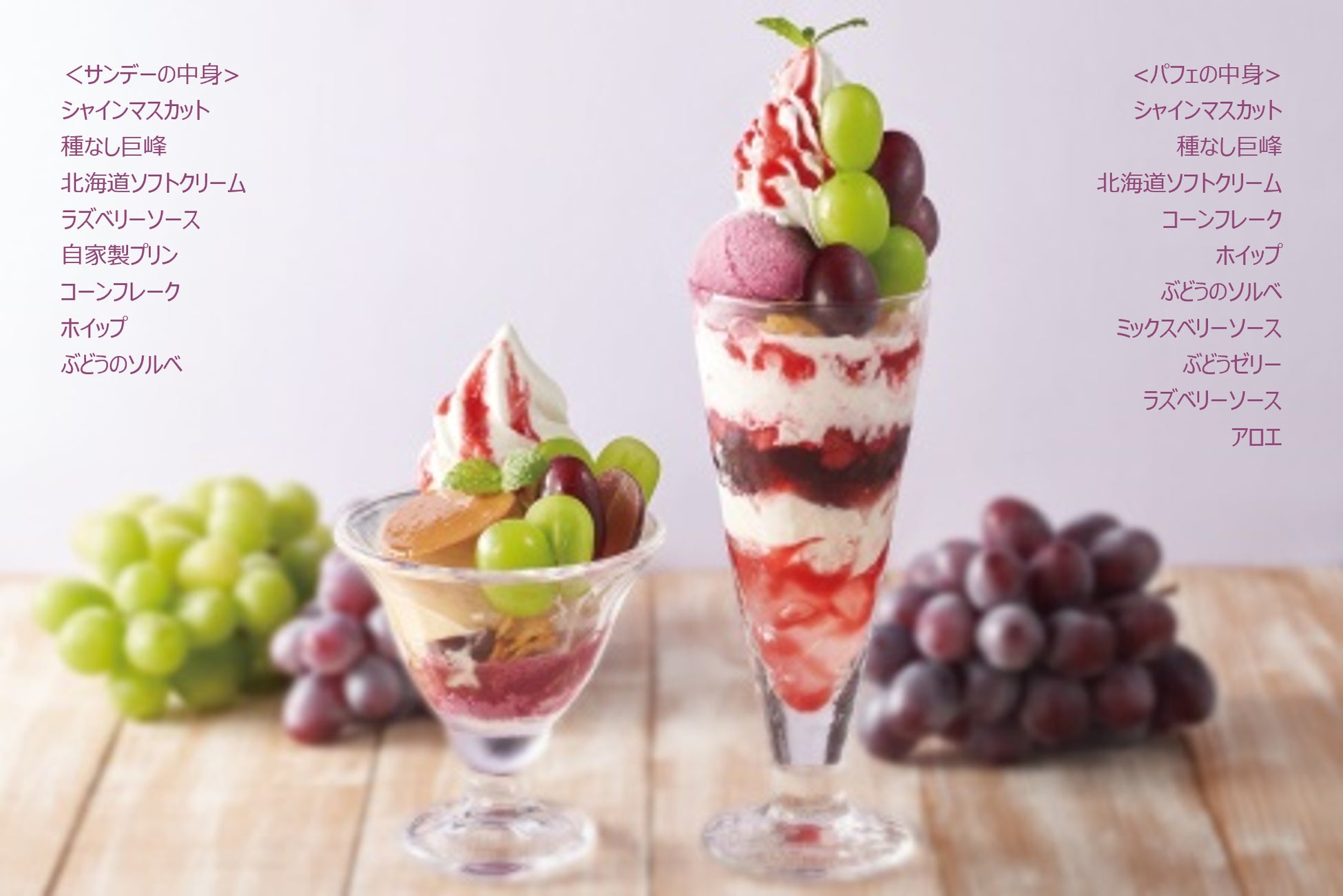 毎年大好評の秋スイーツに、皮ごと食べられる「シャインマスカット」と大きめサイズの「巨峰」が期間限定で再登場いたします。大粒ぶどうがごろごろ入り、アロエやぶどうゼリーなどが何層にも重なった人気のパフェや自家製カスタードプリンがのったサンデーでは、果肉のみずみずしさとクリーミーな味わいのマリアージュをお楽しみ頂けます。