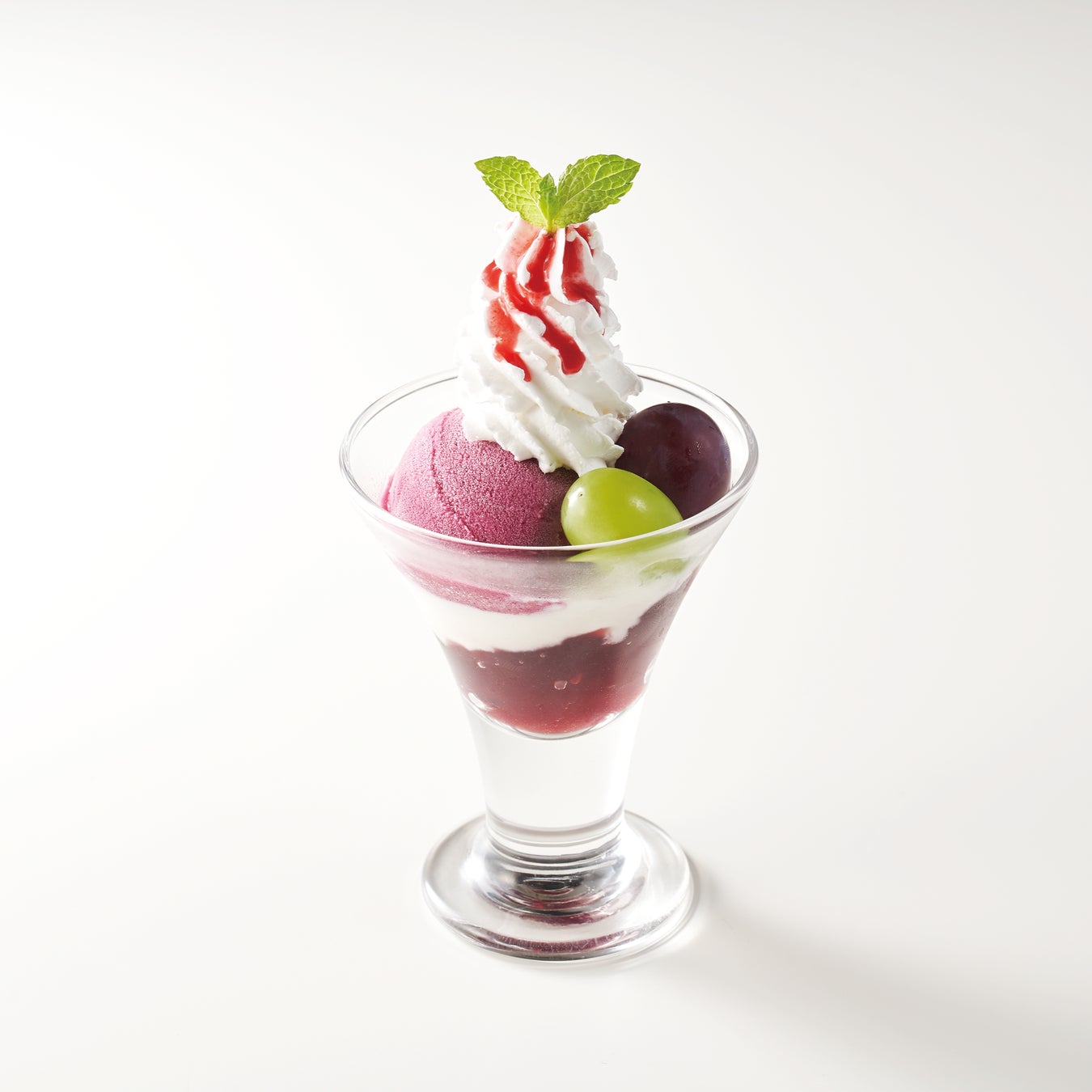ホイップ、ラズベリーソース、ぶどうのソルベ、シャインマスカット、種なし巨峰、ヨーグルト、ぶどうゼリー、ミント