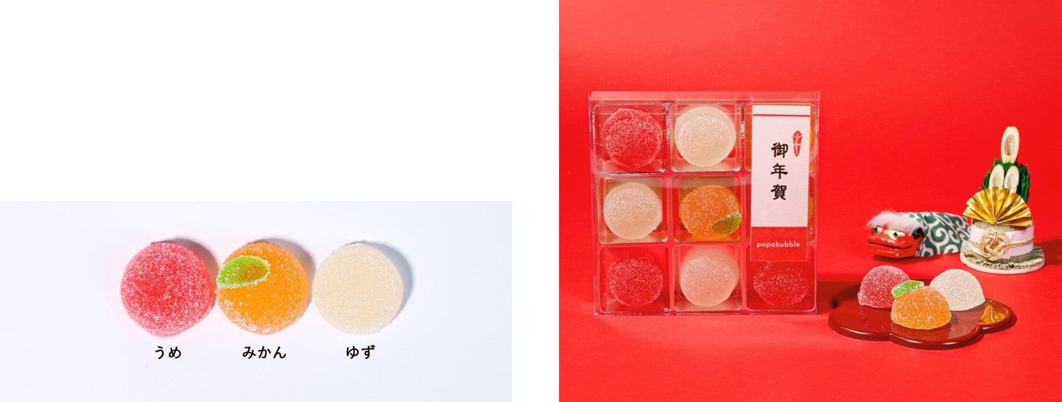 お正月らしい紅白と、中心の「みかん」に見立てた形状が、新年の贈り物にぴったりなフルーツグミです。よりお正月を感じていただけるよう、みかんやゆず、うめといった和風なフレーバーで仕上げました。