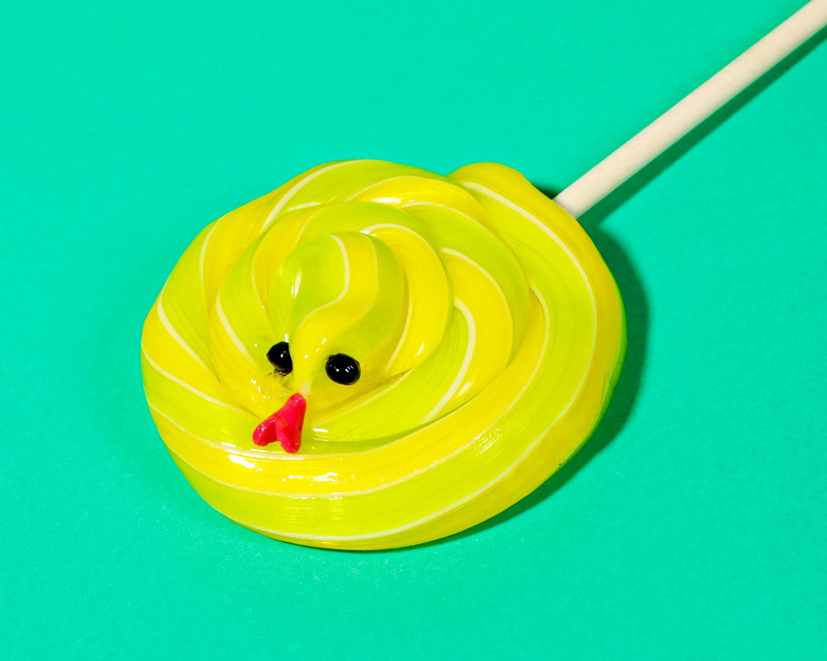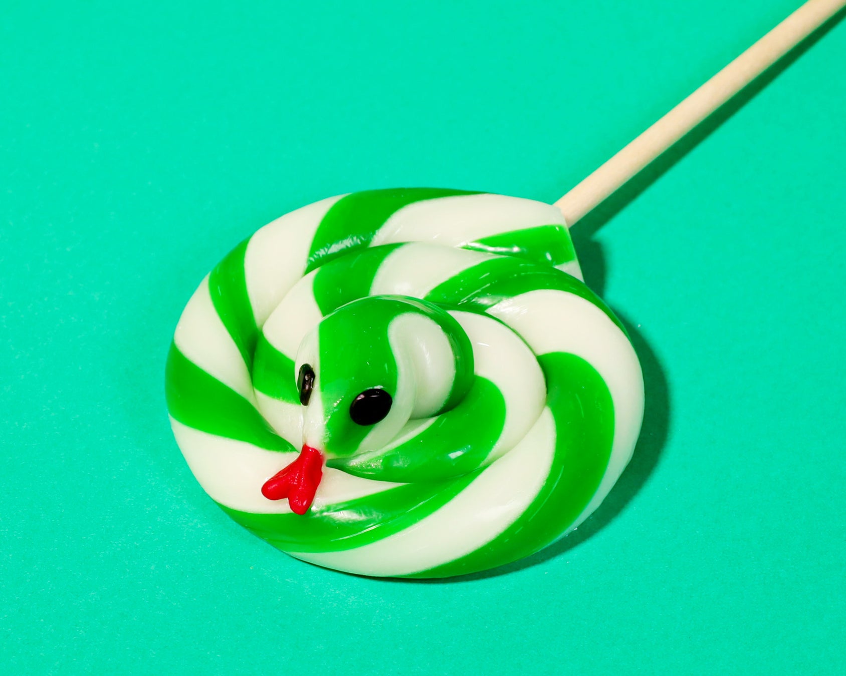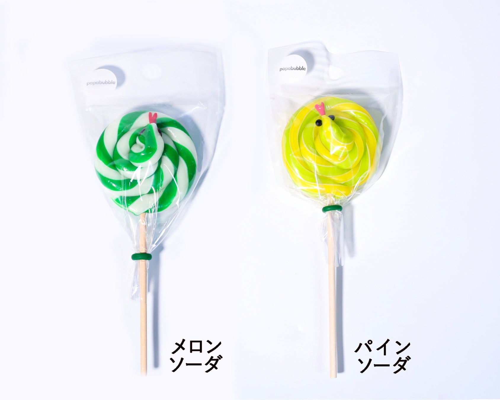 長いキャンディをぐるっと巻いた、「ヘビ」に見立てたロリポップキャンディです。「ヘビは不老長寿や強い生命力につながる」という縁起の良い意味を持っているため、新年の始まりには持ってこいのロリポップとして仕上げました。フレーバーはお子様が食べやすいメロンソーダとパインソーダの2種類。ヘビの顔の向きはランダムなので、ぜひお気に入りの一本をお探しください。