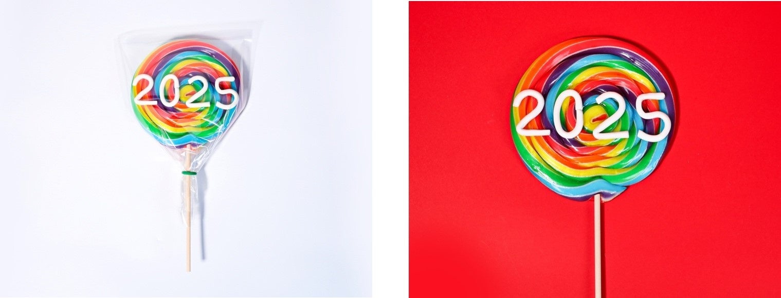 直径約15cmの超BIGサイズ。老若男女が心ときめくレインボーカラーは、新年のお祝いのお供にピッタリな、気分の上がるカラーで仕上げました。「2025」の文字が入った、今年だけの特別なロリポップキャンディです。