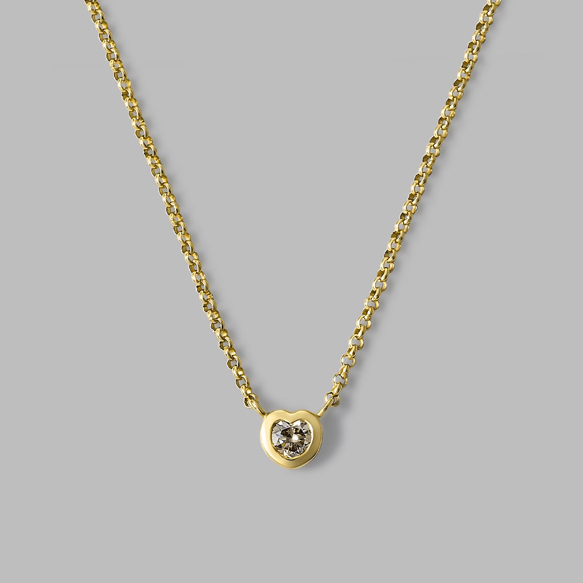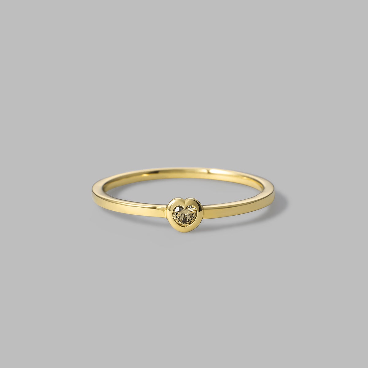 ブラウンダイヤモンドは、その色味のあたたかさと包容力ある輝きで人気の石ですがハート型に仕上げられるほどのクオリティとサイズを持つものは非常に少なく、希少な原石を選び抜き、ラウンドからハートに再研磨することでこのフォルムが生まれました。ラウンドよりも輝きの取り方が難しく、熟練の職人が手作業でカットと仕上げを繰り返すことで、ようやく完成するこのミニマムなハートシェイプ。シルエットに甘さを残しながら、輝きはキリリと引き締まり、モードで可愛いという絶妙なバランスを叶えています。