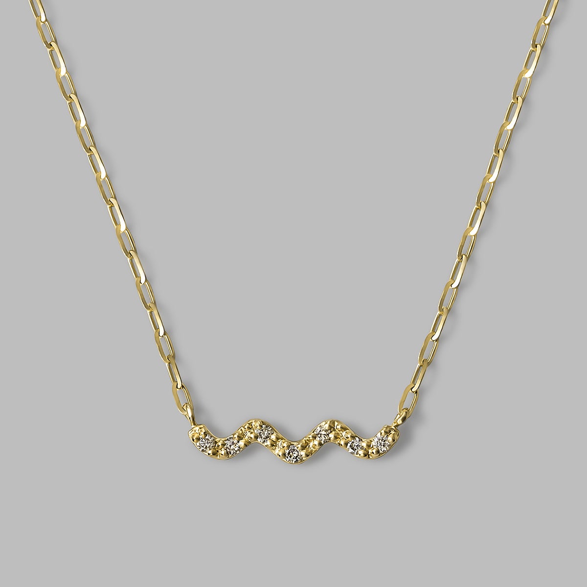 “身に着けるお守り”とも言われるブラウンダイヤモンドの優しい輝きと、繊細なチェーンのニュアンスが重なり合うことで生まれる、静かな存在感が魅力。7粒のブラウンダイヤモンドが連なるリバーシブルネックレスは、小ぶりなモチーフながら、揺れ感のあるカットチェーンと合わせることで上質な印象に。裏表で表情を変えるデザインが、日常のさりげない変化を楽しませてくれます。もう一方は、スクエアに並んだ10石のブラウンダイヤモンドが、すっきりとしたラインを描くモダンなネックレス。主張しすぎないサイズ感ながら、程よい存在感で胸元を上品に彩ります。モードな抜け感と華奢なチェーンのバランスが絶妙で、1本でも重ねづけでも活躍するデザインです。