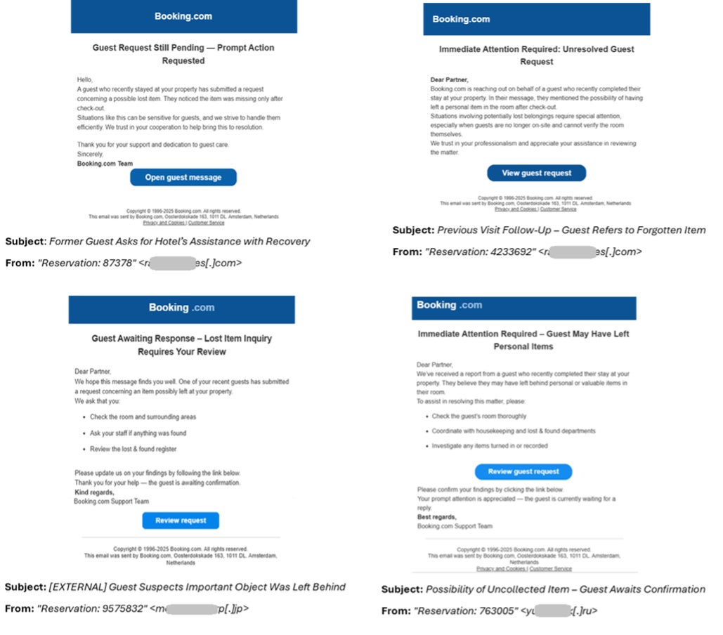 CPRは、Booking.comの物件オーナーを標的とした新たなフィッシング攻撃を発見しました。この攻撃では、ほぼ同じ内容のメールが複数送信されており、いずれも件名には、「宿泊したゲストから忘れ物についての問い合わせがありました」といった内容が記載されていました。送信者名はゲストの予約番号のように見せかけていましたが、実際の送信元はハッキングされたか偽装された企業ユーザーのメールアドレスと思われるものでした。