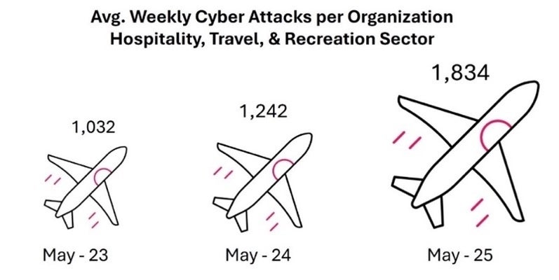 同時に、ホスピタリティ業界はかつてないほどのサイバー攻撃にさらされています。5月だけでも、この業界の1組織当たりの週平均攻撃数は1,834件に達し、2024年5月と比べて48%増加、2年前と比較すると78%も急増しています。こうした組織的な攻撃キャンペーンは、個人の旅行者だけでなく、ホテルチェーンや予約サイト、世界の観光業を支える重要な企業にも深刻なリスクをもたらしています。