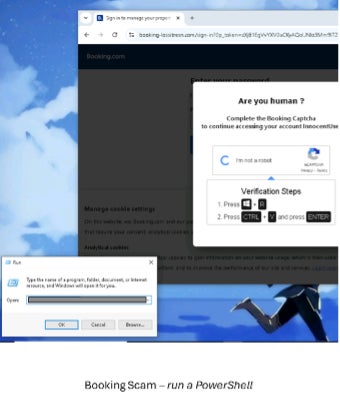 CPRは、ClickFixと呼ばれる偽のreCAPTCHAを利用した悪質なフィッシングサイトを確認しました。このサイトは「booking-lossitresn[.]com」というドメインで運営されており、5月初旬に登録され、booking.comになりすますよう設計されていました。この詐欺サイトは、booking.com公式の物件オーナー向けのログインページを模倣しています。利用者がユーザー名を入力すると、「あなたが人間であることを確認してください」という偽のreCAPTCHAがポップアップで表示されます。利用者がロボットでないことを確認すると、Winキー+R、Ctrlキー+V、Enterキーを押すよう促されます。この操作により悪意のあるコマンドが実行され、PowerShellスクリプトが起動します。その結果、C2サーバーからRATペイロード(AsyncRAT)がダウンロードされ、被害者のコンピュータにインストールされる仕組みになっています。
