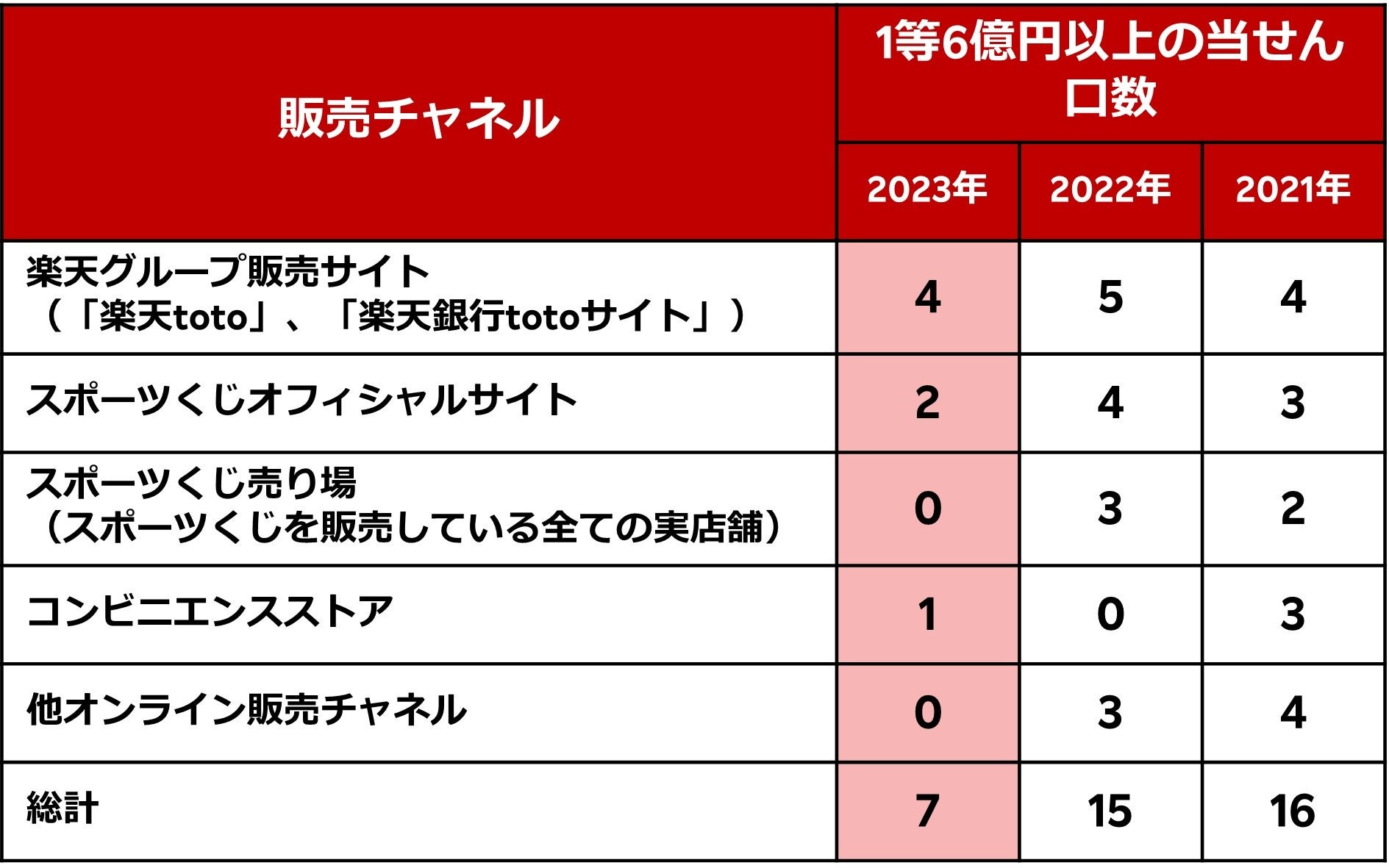 (注4)本発表は、スポーツくじオフィシャルサイトの情報に基づき、特別開催回を含む1等当せん口数を楽天が集計したもので比較しています。なお、2023年の当せん口数は第1343回(販売期間2022年12月29日~2023年1月1日)から第1420回(販売期間2023年12月26日~12月29日)までが対象です。
