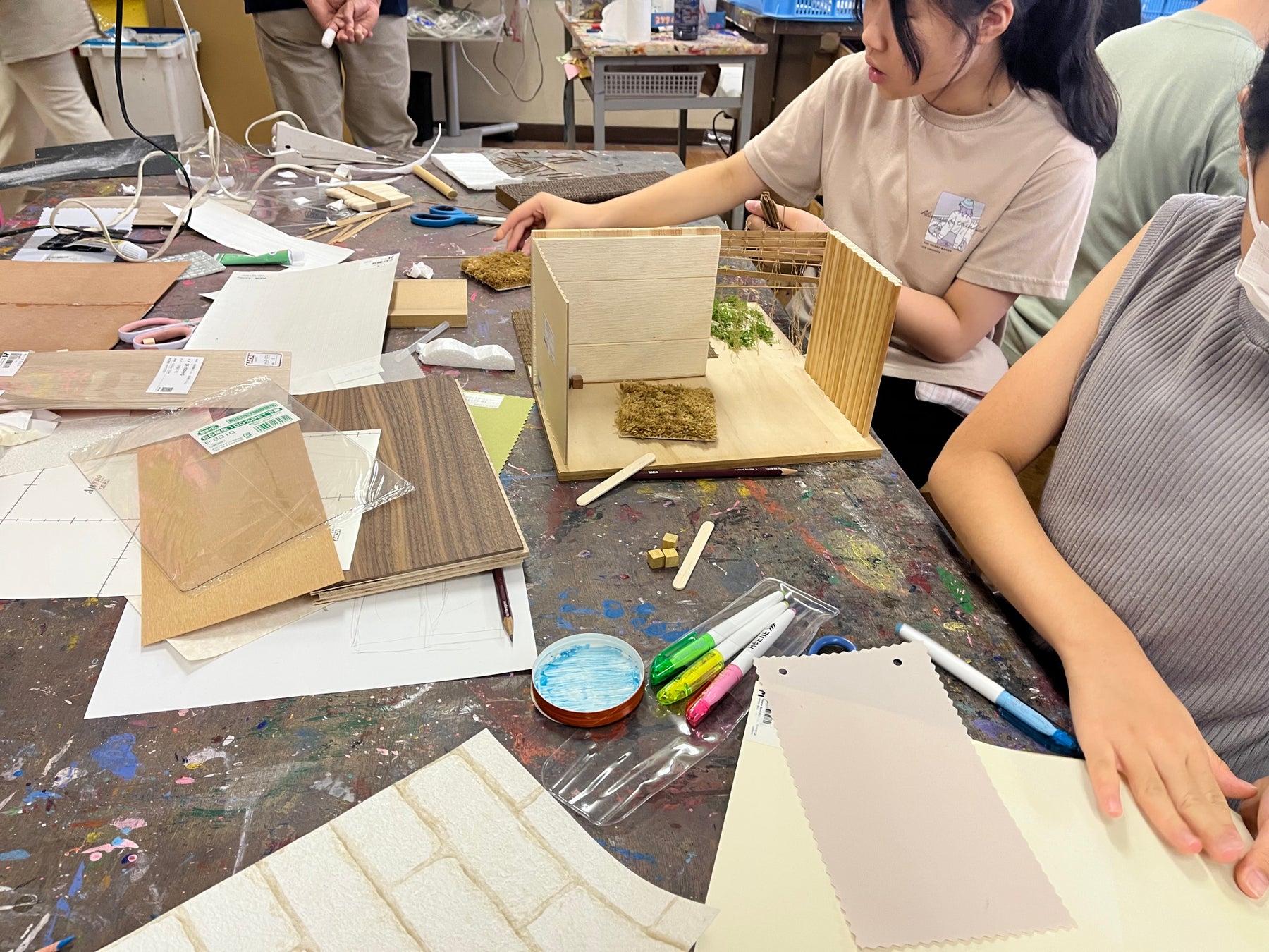 すだれと木材を貼り合わせて涼しげな和風の建物をつくる生徒、白い発泡スチロールの屋根にカラフルなスポンジやレースを載せてみる生徒など、それぞれが自分だけの発想で建物を作り、かつて別のものに使用されていたとは思えないような独創的で新しい模型が生まれていきました。