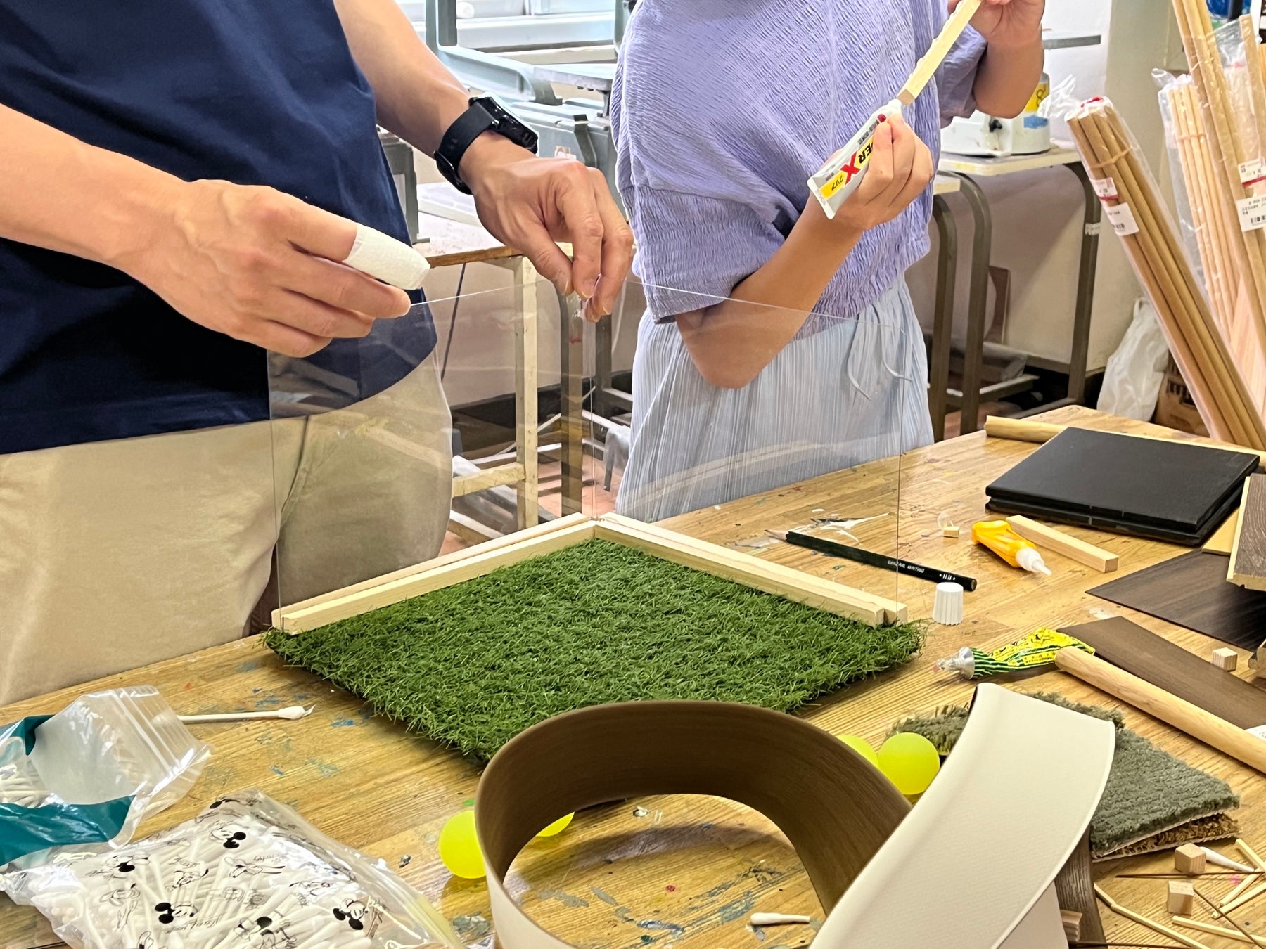 素材の組み合わせは無限大の中で、異素材をしっかりとくっつけて基礎の揺るがない模型にするために、講師としてさまざまな種類の接着剤の使い方や、素材の切断の技術をレクチャーしました。「何と何を接着するのか」、「片面に接着するのか、両面につけるのか」など接着剤選びの重要なポイントをアドバイスすると、「グルーガンではくっつかなかったから強力接着剤を使ってみよう」、「プラスチックの板だけでは平面に立てるのが難しいから、カットした木材を下の方につけて補強しよう」など、子供たちもすぐにコツを覚え、次々とユニークな作品を完成させていきました。