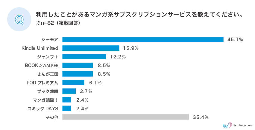 「マンガ」系サブスクリプションサービスでは「シーモア」(45.1%)が最も利用率が高いという結果になりました。2位以降のサービスは支持が比較的分散していますが、「マンガ」系サービスの特徴として、利用プランが多岐にわたることも要因の1つではないかと考えられます。