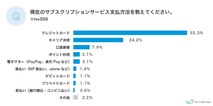 サブスクリプションサービスの支払方法は「クレジットカード」(55.3%)が主流であることがわかります。次いで、「キャリア決済」(24.2%)や「口座振替」(7.9%)が続きます。全体の8割以上を上記3つが占めることから、サブスクリプションサービスの支払方法は選択肢が限られている場合が多いことが推察されます。