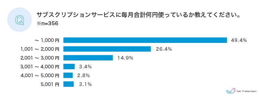 サブスクリプションサービスに対しては、1か月に「2,000円以下」使う人が多いという結果が出ました。1か月の平均利用金額が約1,430円であり、1~2サービスを契約している人がボリューム層であると考えられます。