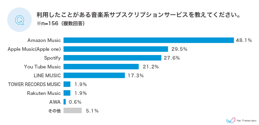 「音楽」系サブスクリプションサービスを利用している人の中で「Amazon Music」(48.1%)を利用したことがある人は約半数を占め、堂々の1位。次いで、「Apple Music」(29.5%)や「Spotify」(27.6%)など代表的なサービスが並んでいます。また、2つ以上のサービスを選択した人が55人であり、全体の3分の1以上を占めることから、複数サービスを試した後に、利用するサービスを検討する人が多いと推察されます。