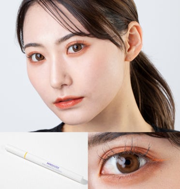 今回はオレンジのアイシャドウに更にMINSHZEEのオレンジのアイライナーを重ねる事でオレンジ度をUPさせています。アイシャドウベースを使用後、オレンジアイシャドウをアイホールに沿ってグラデーションで重ねます。黒目幅をスタート目安にし、目尻までラインに沿うように入れます。目を長く大きく見せたい方は長めに、目元が元々はっきりしている方は短めに跳ね上げて推しカラーをより強調させましょう!
