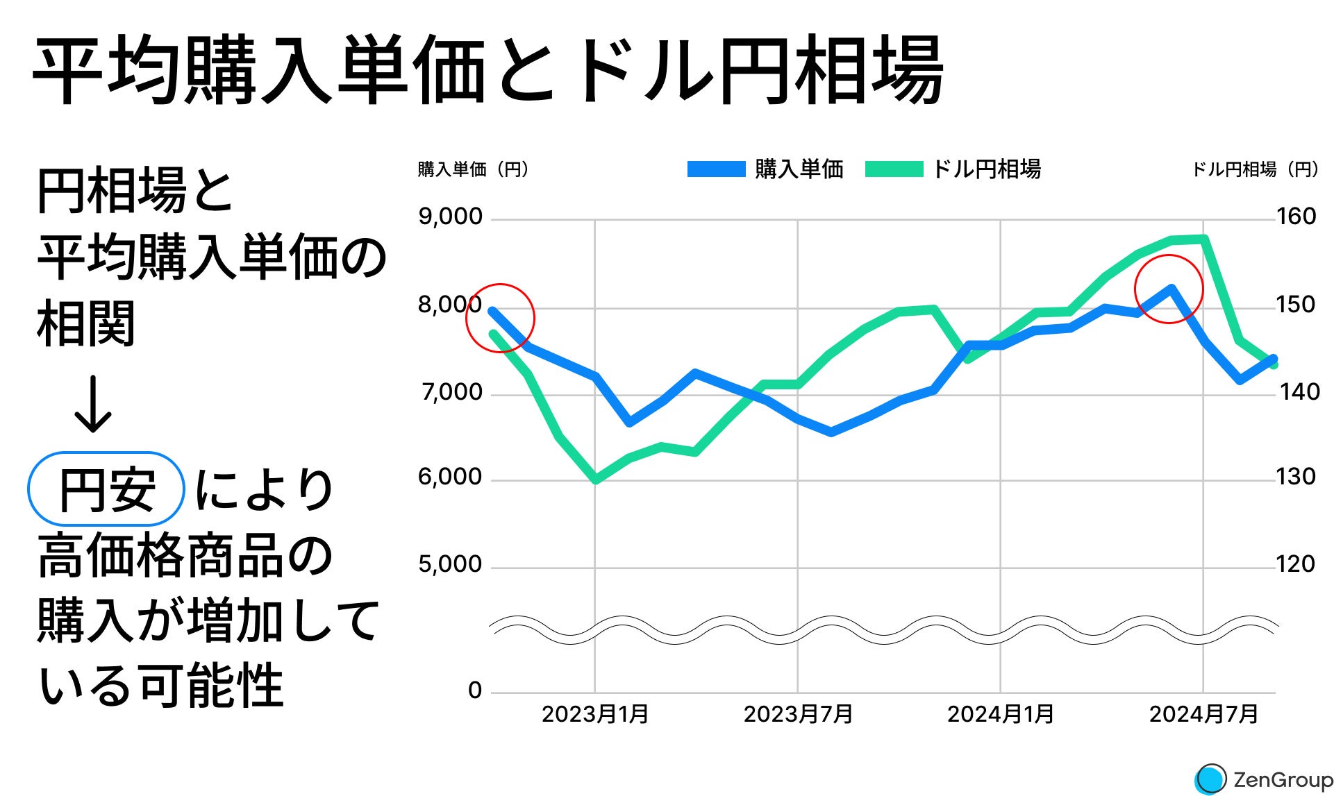 円安の期間では、平均購入単価が上昇する傾向があります。例えば、2022年10月の147.01円や2024年6月の157.82円(※)など、円安が進んだ月では、平均購入単価も比較的高い水準を維持しています。円安が進むことで、日本の商品が海外の消費者にとって割安に感じられ、より高価格商品の購入が増加している可能性があります。