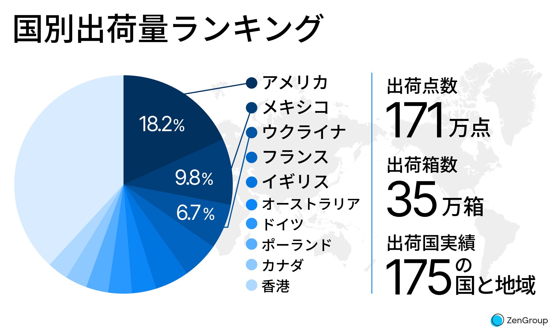 出荷点数の上位割合を見てみると、最も多かったのは「アメリカ」、第2位は「メキシコ」、第3位は「ウクライナ」となりました。