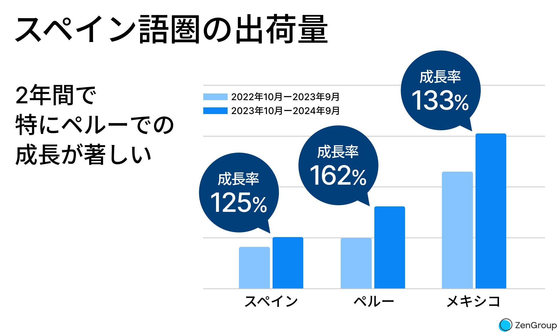 スペイン語圏のメキシコ、ペルー、スペイン。各国とも、いずれも前期間と比較して出荷量が増加していますが、特にペルーの増加率が最も高くなっています。