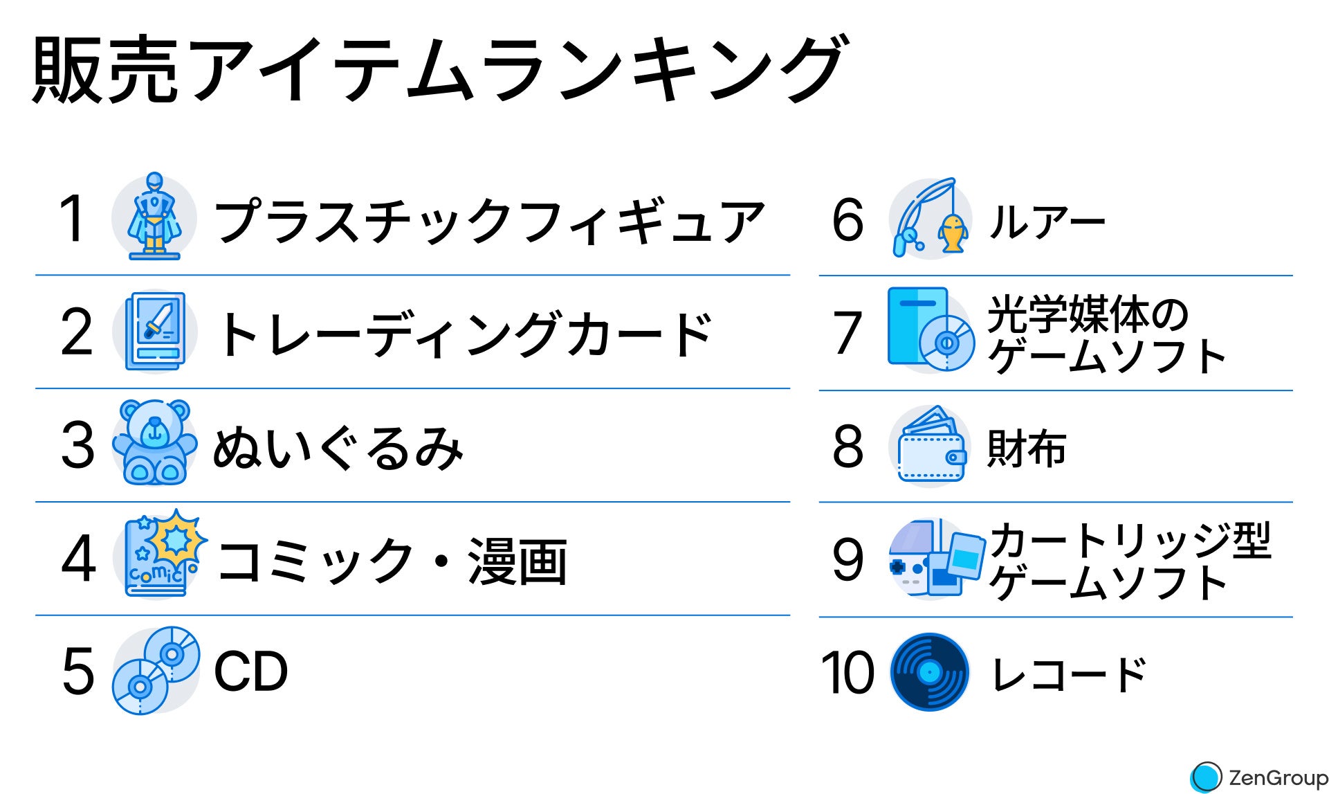 最も購入件数の多かった分野は「プラスチックフィギュア」でした。2位にトレーディングカード、3位にぬいぐるみが続きます。