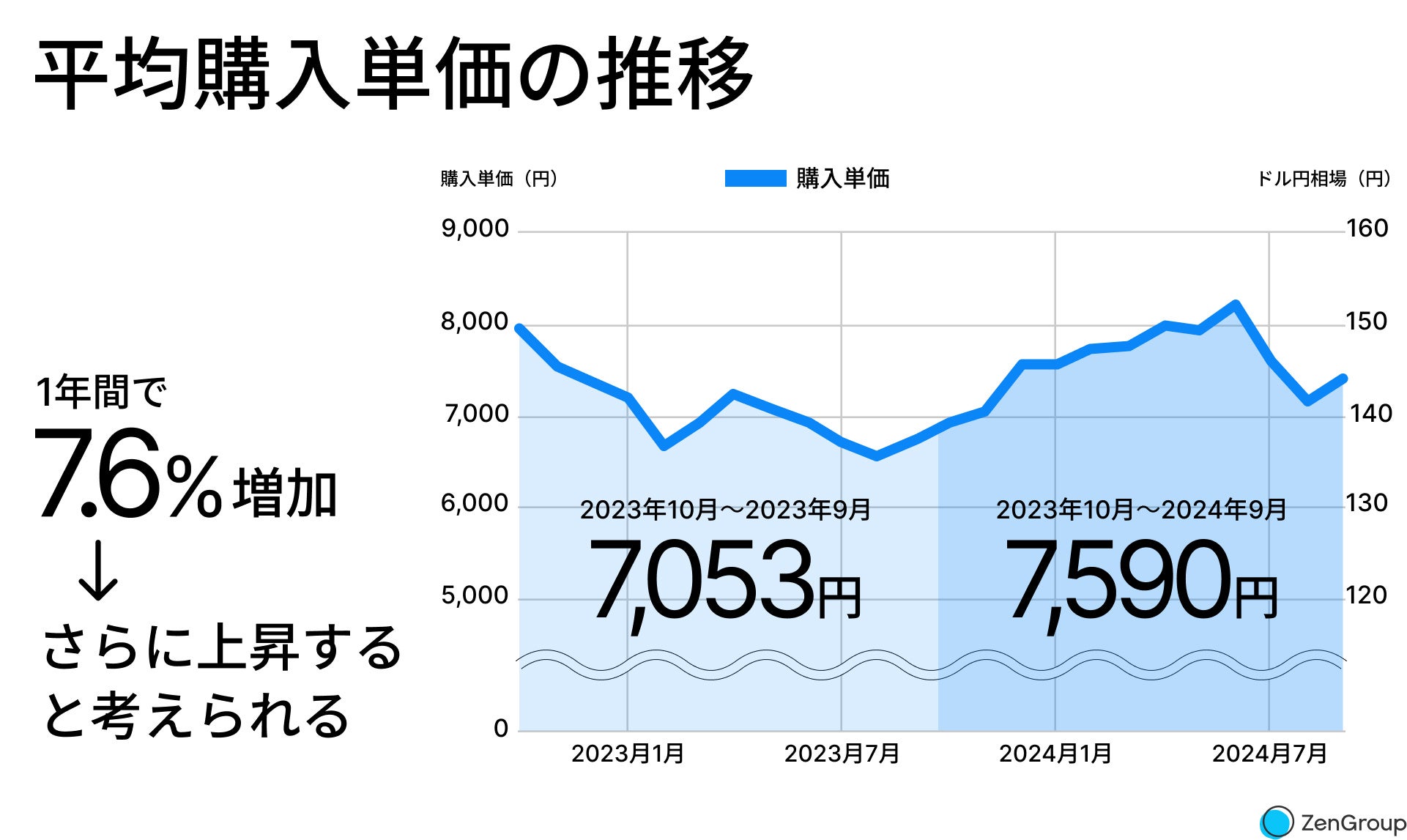 増加率は約7.6%となっています。変動はありつつも、今後も同様に成長が続くと仮定すると、平均購入単価はさらに上昇すると予想されます。また、円安が進行する場合は、より平均購入単価を押し上げる可能性があります。