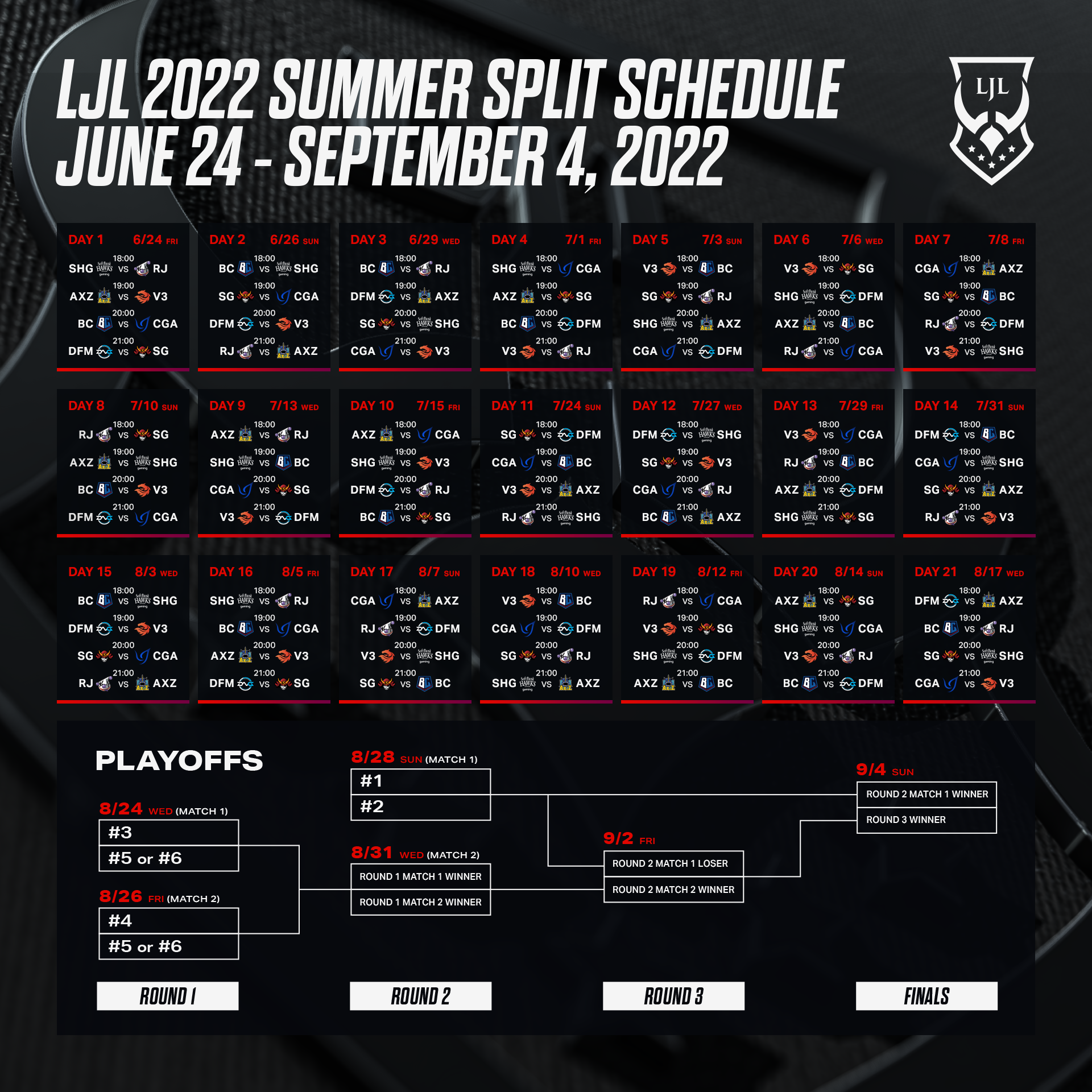 LJL 2022 Summer Split は平日開催を含む週3日開催のオンラインフォーマットで行われ、プレイオフを含めたシーズン(6月24日〜9月4日)累計の試合数は100試合以上を予定しております。全ての試合は無料でオンライン観戦いただけ、試合後にはハイライト解説番組「LJL Aftershow」をお届けします。スケジュールの詳細は公式サイトでご確認いただけます。