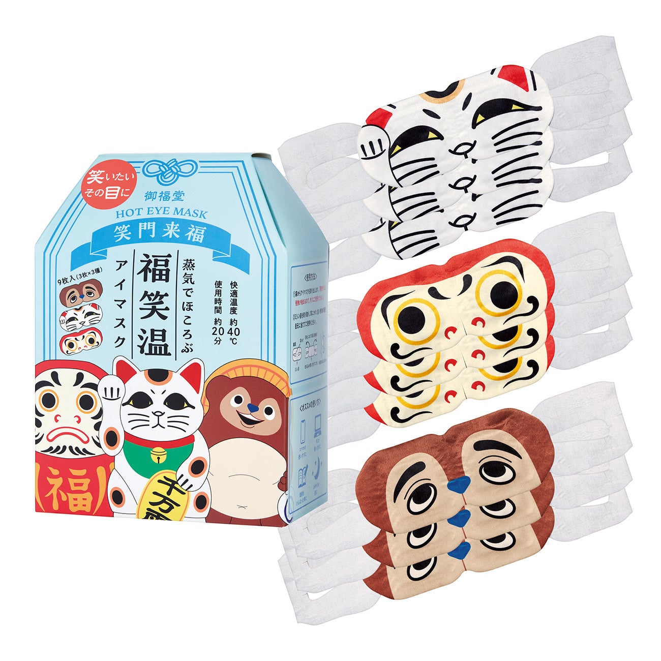 セット内容:ホットアイマスク 招き猫、だるま、たぬき 各3個
