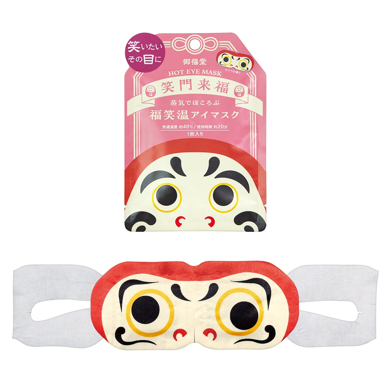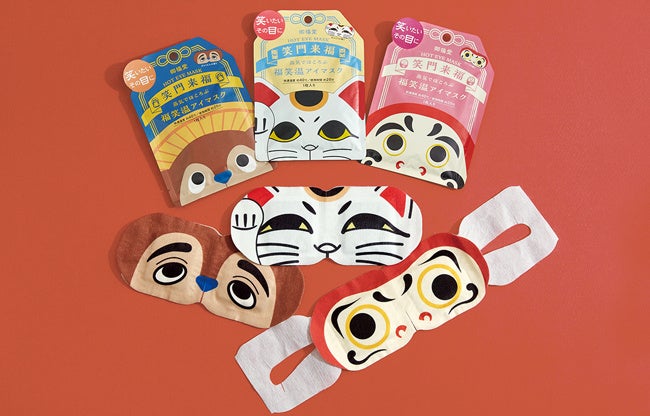 縁起物をモチーフにした福笑いのような温熱アイマスクで笑顔を作って福を招きましょう。
