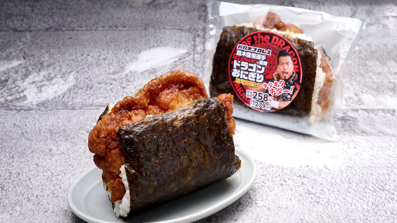 鷹木信悟選手のドラゴン(竜)をイメージしました。醤油でしっかりとした味をつけた、大きな鶏“竜”田揚げがドカンと入ったボリューム満点のおにぎりです!