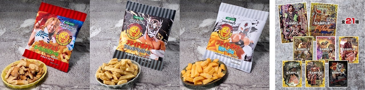 全21種類のオリジナル新日本プロレス選手カードが、スナック1袋につきランダムに1枚付いています。