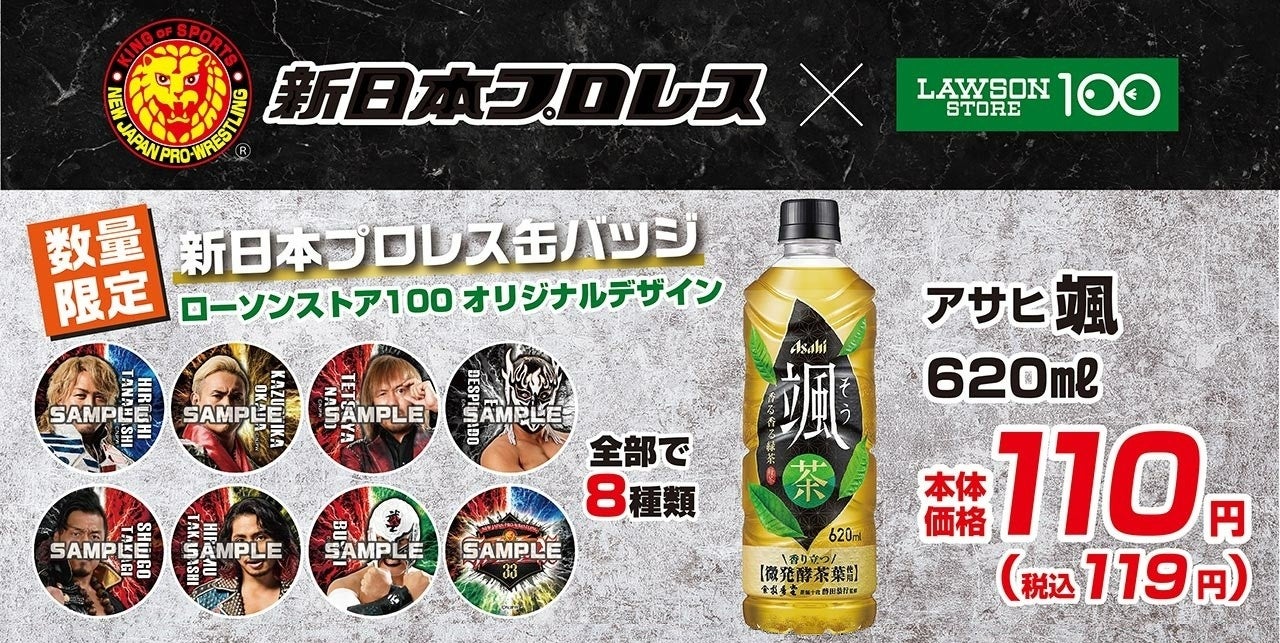 株式会社ローソンストア100(神奈川県川崎市)が運営する「ローソンストア100」(647店舗/2023年6月末現在)では、2023 年7 月19 日(水)より販売開始した新日本プロレス所属選手監修のパンやおにぎり、オリジナルカードつきのスナック菓子などのローソンストア100オリジナル商品やアサヒ飲料 颯には新日本プロレスオリジナル缶バッジを景品とした商品が発売から5日間で合計販売数10万個を突破し、現在好評販売中です。