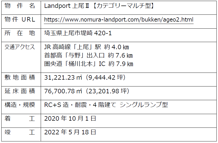 野村不動産株式会社(本社:東京都新宿区/代表取締役社長:松尾 大作、以下当社)は、当社が手掛ける高機能型物流施設「Landport(ランドポート)」シリーズにおいてLandport上尾Ⅱが5月18日に竣工満床稼働したことをお知らせいたします。