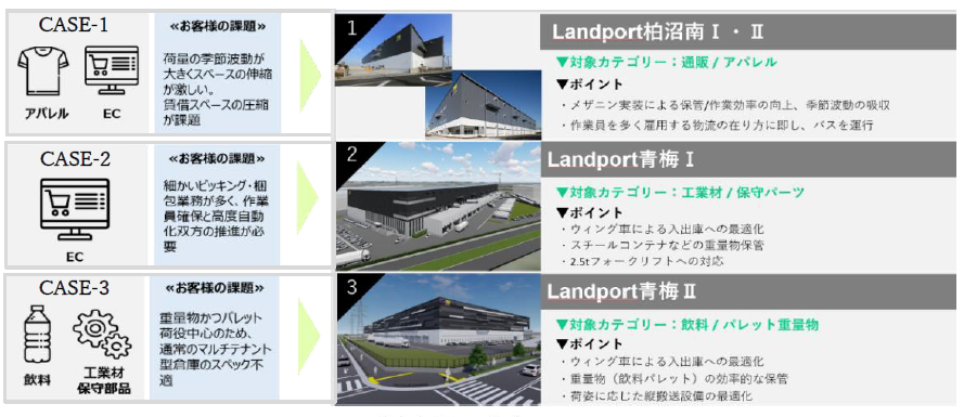 「Landport」シリーズでは、ご入居いただくお客様の物流オペレーション最適化を目指し、入居企業の業種(=カテゴリー)を物件毎あるいはフロア毎に特定し、一般的な汎用スペックにカテゴリー特有の機能を標準仕様として付加した、カテゴリーマルチ型物流施設の開発を推進しています。