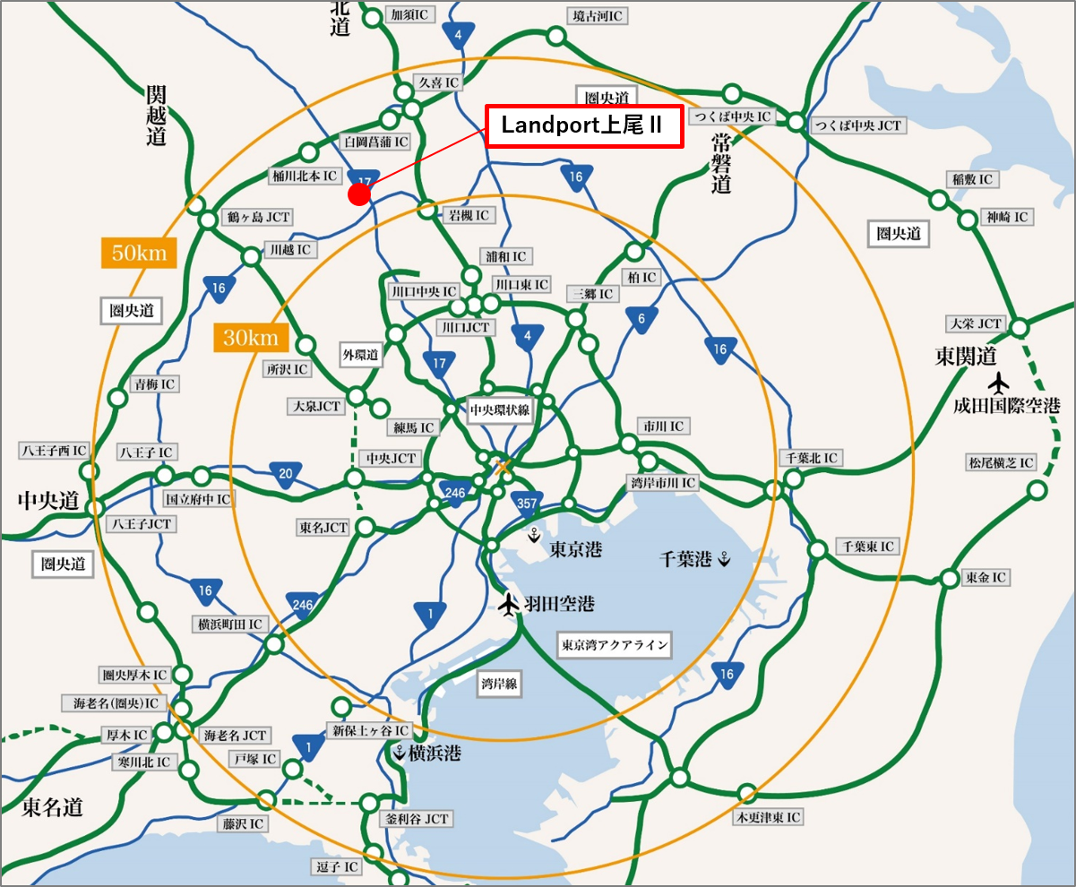 Landport上尾Ⅱは、「Landport」シリーズ初となるフロア毎に異なるカテゴリーを想定した仕様とし、温度帯保管など幅広いニーズに応える設計を実現したことでEC系・医療機器系・出版・書籍系などさまざまな業種の企業の入居が決定いたしました。また、圏央道「桶川北本」ICまでの上尾道路の開通や今後の首都高速道路の延伸計画など、輸配送の利便性が向上している上尾エリアにおける物流の要として既に満床稼働しておりますLandport上尾Ⅰと本物件を通じ、地域の発展に貢献してまいります。