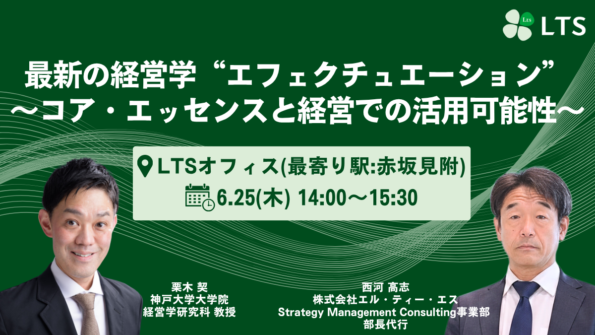 株式会社エル・ティー・エス(本社:東京都港区、代表取締役 社長執行役員:樺島 弘明、以下LTS)は、LTS主催セミナー「最新の経営学“エフェクチュエーション” ~コア・エッセンスと経営での活用可能性~」を、6月25日(木) 午後2時より、LTS 本社オフィス(最寄り駅:赤坂見附)で開催します。 お申し込みはイベントページよりお願いいたします。 ※事前登録制・参加費無料