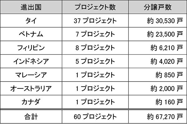 当社では、現在、ASEAN諸国等を中心に不動産事業を強化すべく、さまざまな取組を進めていますが、そのうち海外での住宅分譲事業は、本プロジェクトにより、総計60プロジェクト(約67,270戸)となります。