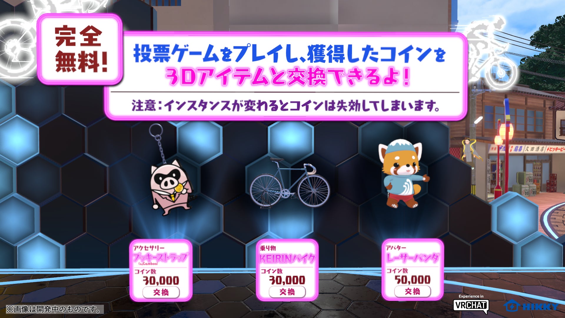 ブース内にはミニチュアの競輪コースとオッズ表示が設置されており、コース内では競輪選手の3Dアバターが本物さながらのレース展開をするのを間近で見ながら、投票体験が楽しめます。見事投票が当たるとコインが付与され、静岡競輪のマスコットキャラクター「レーサーパンダ」の3Dアバターなど、3Dモデルと交換することが可能です。メタバースならではのイマーシブでリアルな投票体験をぜひお楽しみください。