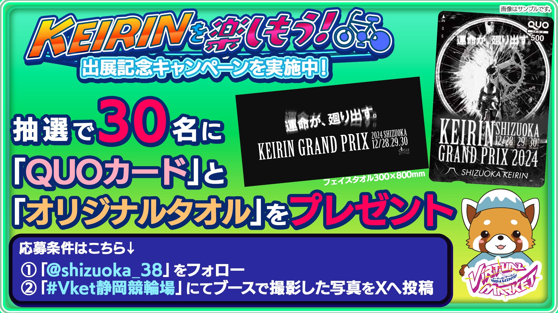 静岡競輪公式Xをフォローのうえ、静岡競輪場ブース内で撮影した写真を「#Vket静岡競輪場」を付けてXに投稿いただいた方の中から抽選で、KEIRINグランプリ2024オリジナルタオルとQUOカードが当たるプレゼントキャンペーンを実施します!こちらもぜひ奮ってご参加ください。