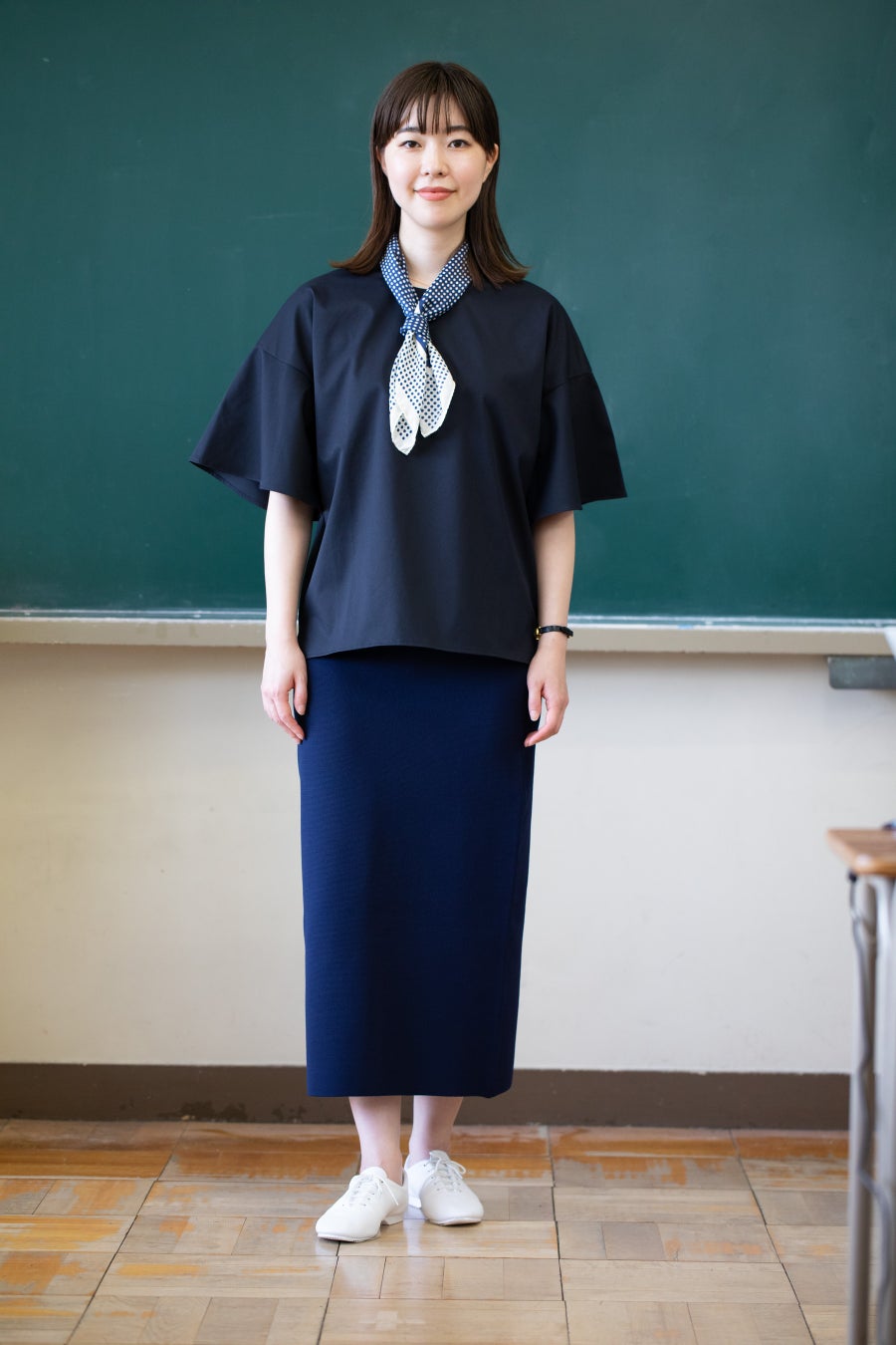 ブラウスは、学校で着替えるシーンを想定し、脱ぎ着しやすいように肩にファスナーを仕込みました。背面の丈を長くし、しゃがんでも下着が見えないように設計しました。スカートは、毛玉・型崩れ・シワが起こりにくいニット素材を使用。伸縮性が高く、階段の上り下りなどアクティブな動きにも対応します。また、やや長めの丈感が上品な印象を与え、個人懇談にも着用可能です。