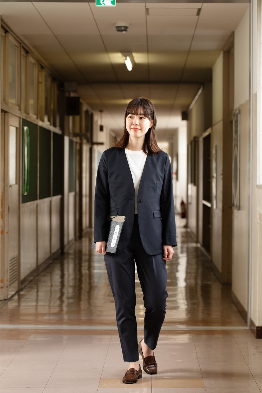 セットアップは、学校行事から私生活まで着用できるよう「汎用性・高機能性・おしゃれ」の3拍子を重視して制作しました。ジャケットは、黒板を書く際や肩周りの大きな動作も快適にできるようゆとりのあるサイズにし、背中が見えにくく、お尻もしっかり隠れる丈感にしました。パンツは、ウエスト両サイドにゴムを内蔵することで、ストレスなく長時間着用できます。新色のダークネイビーは、既存のネイビーに比べ、落ち着いた印象を与えます。