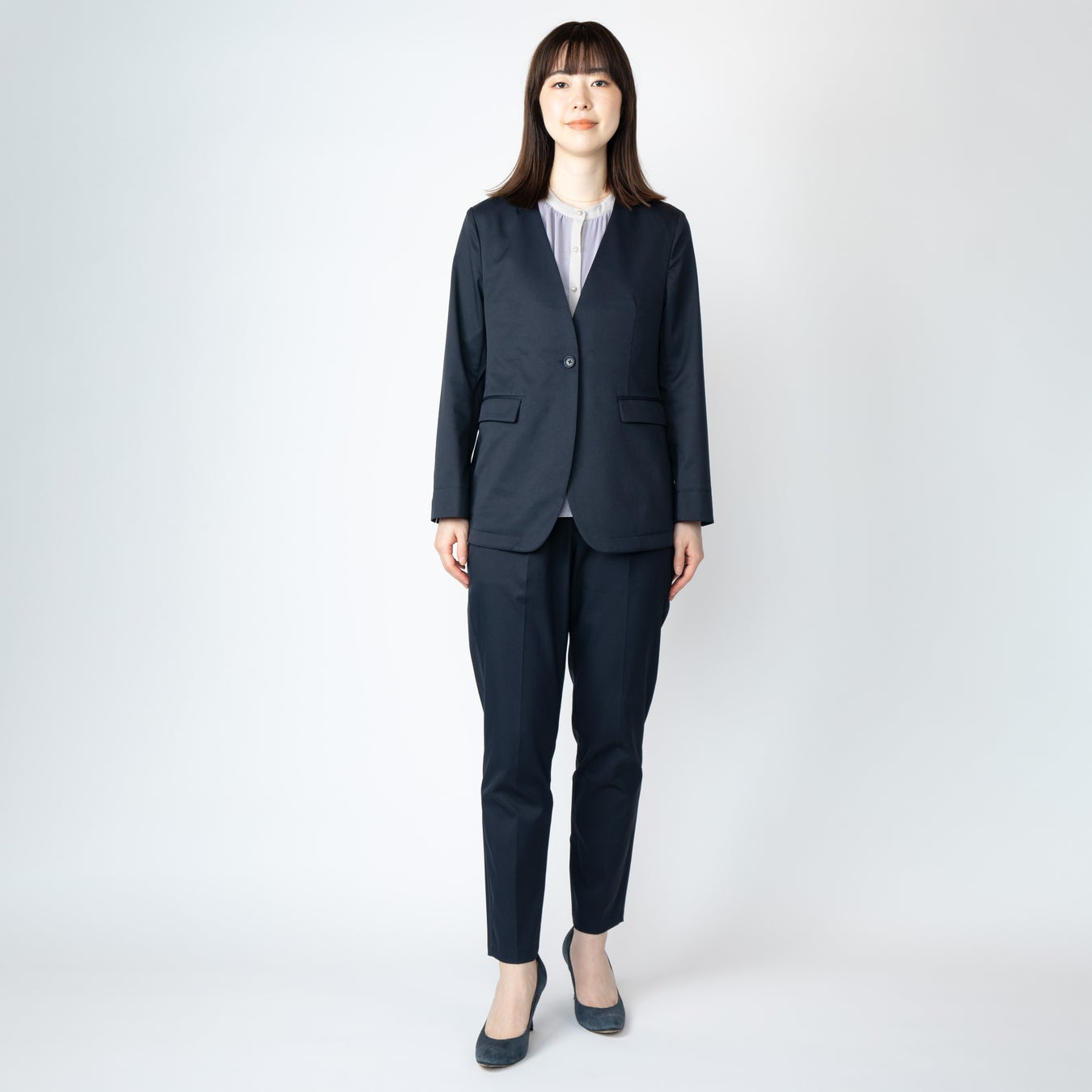 特 長:授業参観や面談でも使えて、固い印象になりすぎないノーカラージャケットは、黒板を書く際や肩周りの大きな動作も快適にできるようゆとりのあるサイズにし、背中が見えにくく、お尻もしっかり隠れる丈感にしました。従来品と縫製を変え、肩パットがなくても肩の丸みが出にくいシルエットに仕上げました。ジャケット内側はポケット2つにペン挿し、センセイカプセルのオリジナルピスネームを配置。パンツはウエスト後ろにあったゴムを両サイドに内蔵することで、腰回りのもたつきが一切なくなり、かつストレスなく長時間着用できます。すっきりキレイに見えるバックスタイルで、トップスをインしてもスマートにきまります。形はテーパードで、足を長く見せるセンタープレス加工を施しました。生地には独自開発素材「ultimex」を使用し、伸縮性・耐久性・撥水性・速乾性、しわになりにくいイージーケアに加え、365日洗濯機で丸洗いできます。