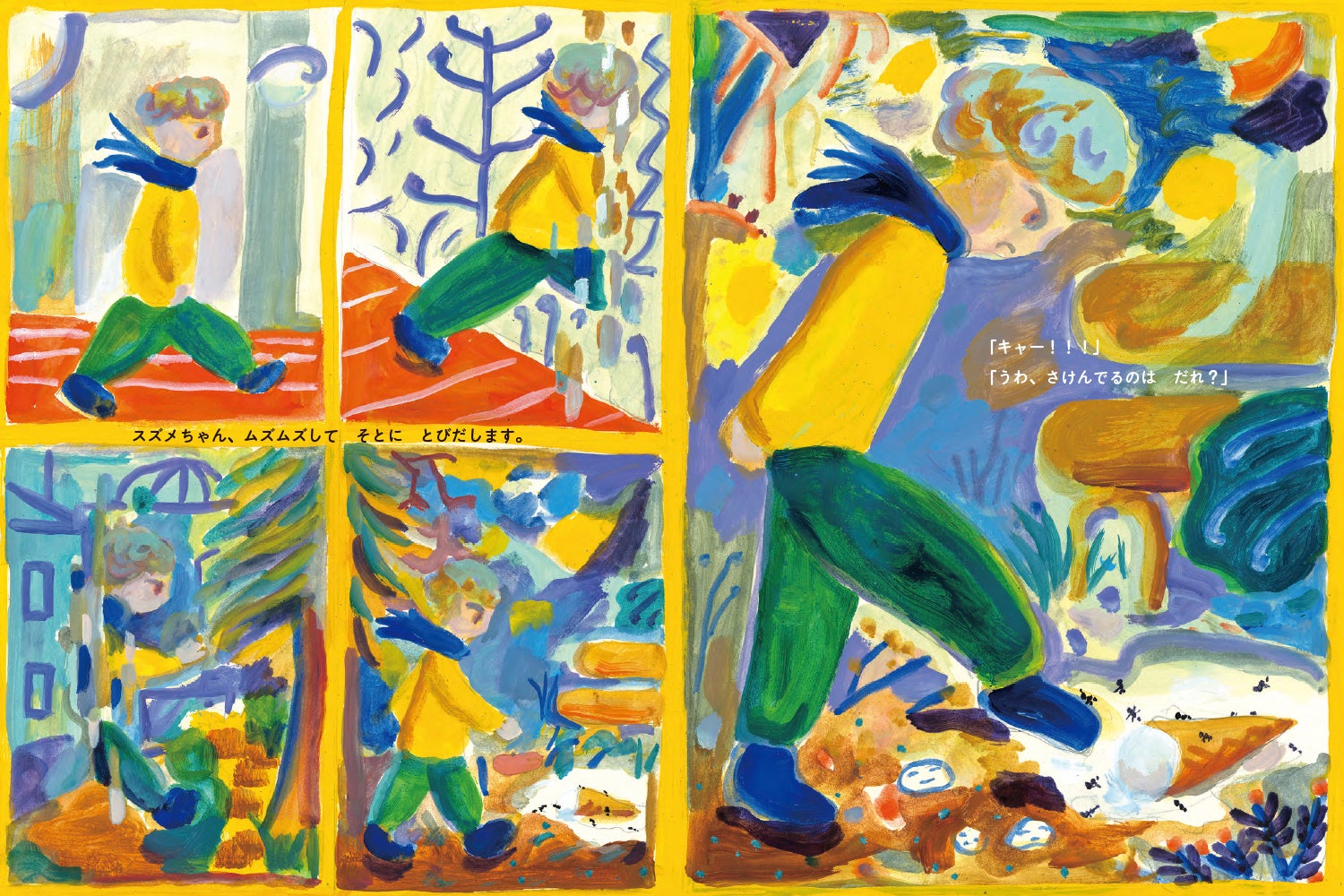 うちゅうの星に住むスズメちゃんが「うちゅうじんになる実」を食べました。ムズムズして外に出てみると——なんと、まわりの生き物がみんな人間の姿に見えてきたのです。