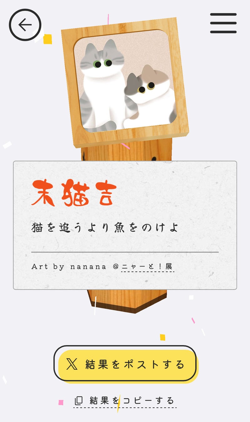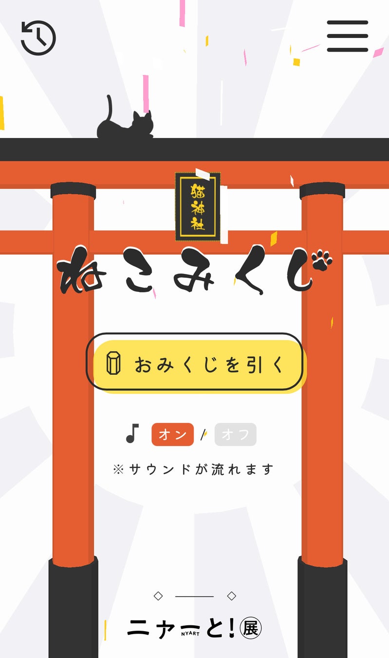 ニャーと!展の開催に合わせて、公式サイトでは「ねこみくじ」(PC/スマートフォンでアクセス)を公開中です。1日1回、どなたでもおみくじを引くことができます。お出かけの前に本日の「猫運」をお試しください。