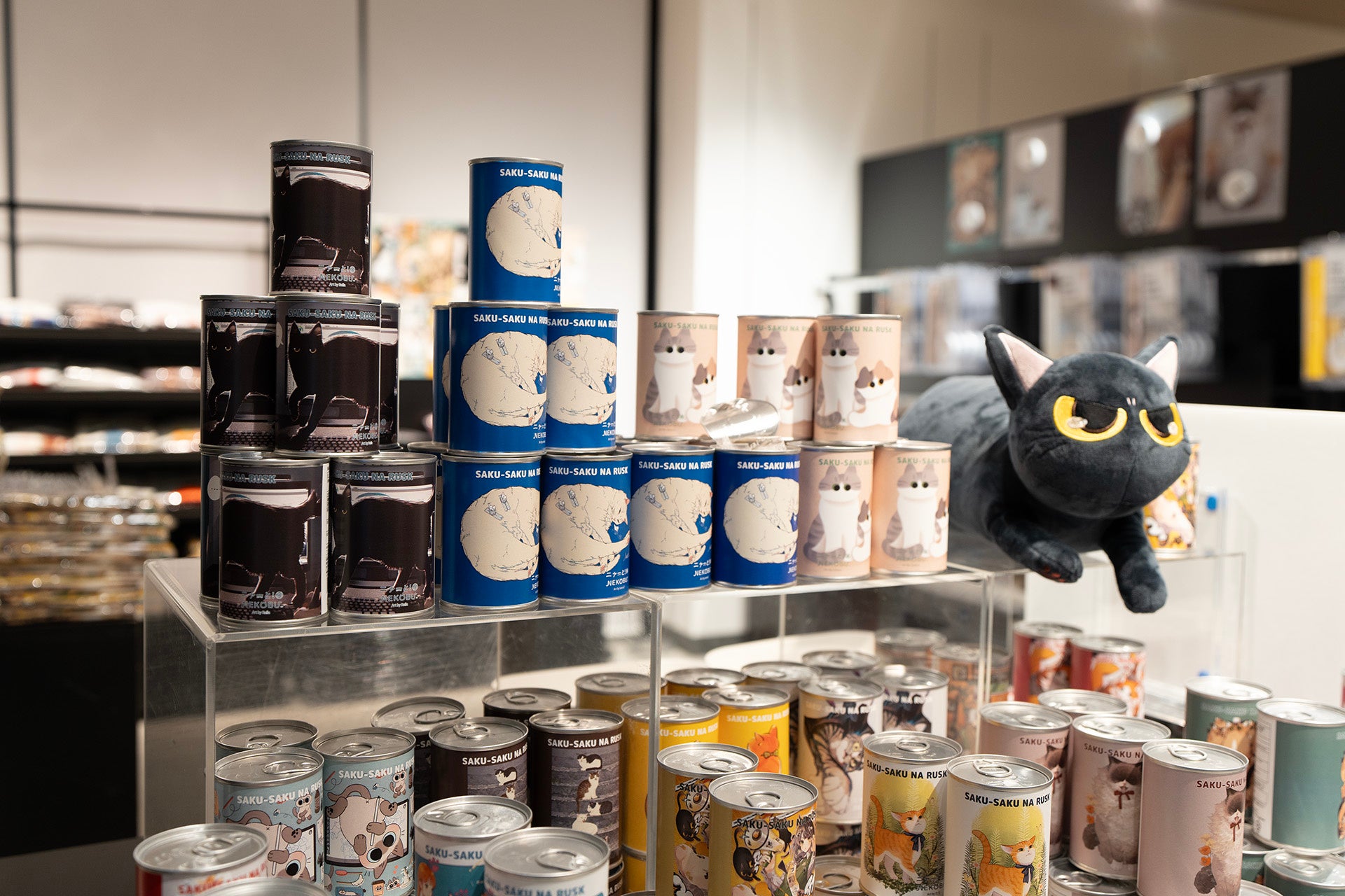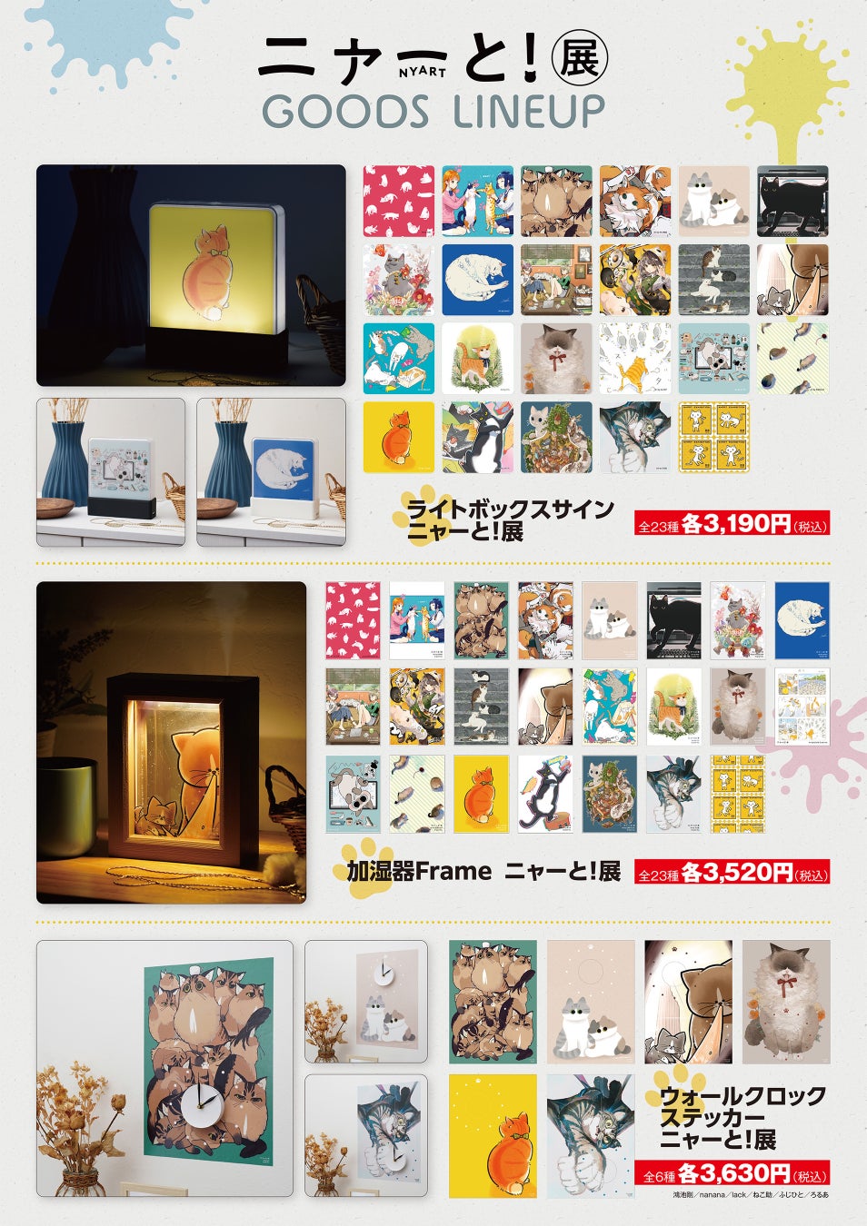 株式会社フェリシモ「猫部」とコラボした缶入りルイボスティーやメモリアルビッグタオル、東洋ケース株式会社とコラボしたライトボックスサインや加湿器Frameなど様々なバリエーションの猫イラストグッズを取りそろえております。